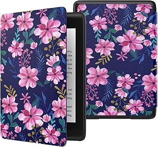 MoKo Étui de Protection pour Nouvel Kindle Paperwhite (10ème Génération,Modèle 2018), Coque Pliable en Cuir Mince Léger avec Auto Réveil/Veille pour Amazon Kindle Paperwhite 2018 - Bleu + Fleur Rose