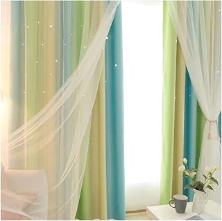 Hongma 1 Set Rideau + Voilage Deux Couches Etoiles Star Blackout Curtains Rainbow Gradient Stripe Hollow-Out Stars Curtains Tulle Double Layer Window Blackout Drapes for Living Room